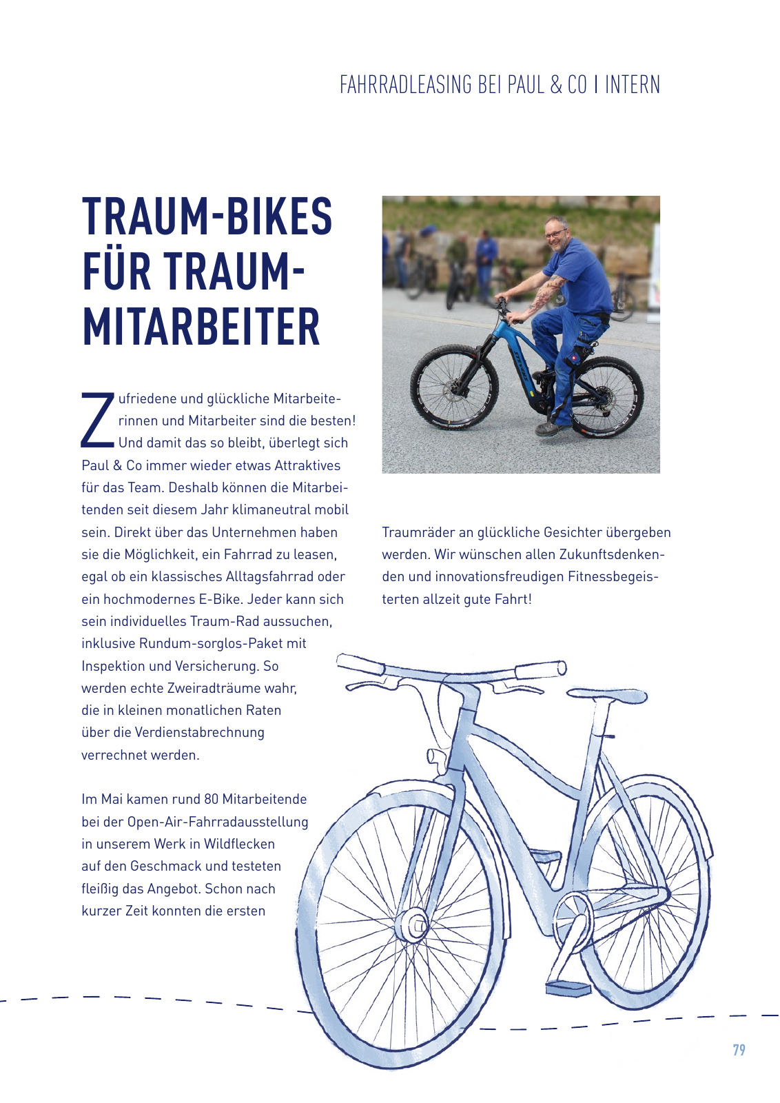 79 Zufriedene und glückliche Mitarbeite rinnen und Mitarbeiter sind die besten Und damit das so bleibt überlegt sich Paul Co immer wieder etwas Attraktives für das Team Deshalb können die Mitarbei tenden seit diesem Jahr klimaneutral mobil sein Direkt über das Unternehmen haben sie die Möglichkeit ein Fahrrad zu leasen egal ob ein klassisches Alltagsfahrrad oder ein hochmodernes E Bike Jeder kann sich sein individuelles Traum Rad aussuchen inklusive Rundum sorglos Paket mit Inspektion und Versicherung So werden echte Zweiradträume wahr die in kleinen monatlichen Raten über die Verdienstabrechnung verrechnet werden Im Mai kamen rund 80 Mitarbeitende bei der Open Air Fahrradausstellung in unserem Werk in Wildflecken auf den Geschmack und testeten fleißig das Angebot Schon nach kurzer Zeit konnten die ersten TRAUM BIKES FÜR TRAUM MITARBEITER Traumräder an glückliche Gesichter übergeben werden Wir wünschen allen Zukunftsdenken den und innovationsfreudigen Fitnessbegeis terten allzeit gute Fahrt FAHRRADLEASING BEI PAUL CO I INTERN